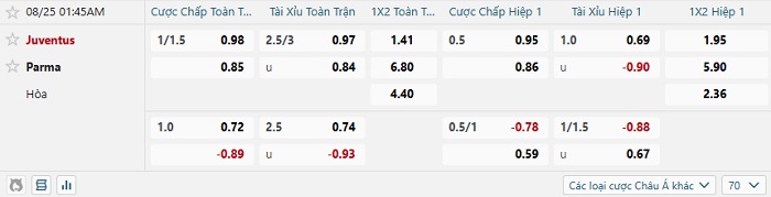 Soi kèo châu Á, kèo Juventus vs Parma