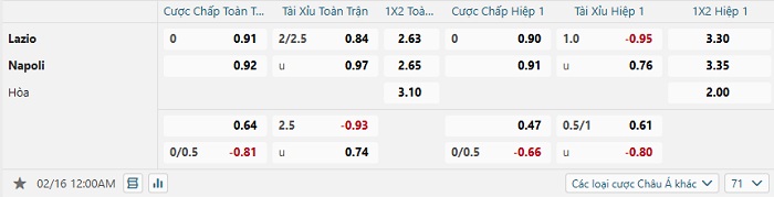 Bảng tỷ lệ kèo bóng đá Lazio vs Napoli