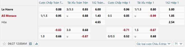Bảng tỷ lệ kèo bóng đá Le Havre vs Monaco