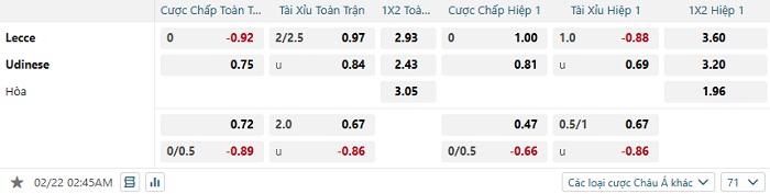 Bảng tỷ lệ kèo bóng đá Lecce vs Udinese