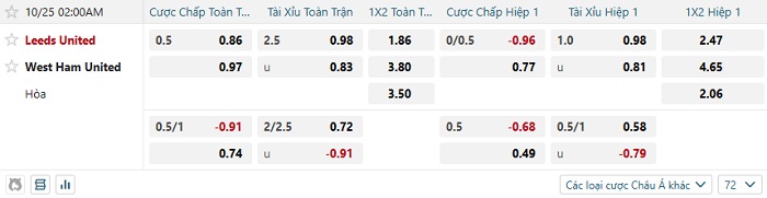 Bảng tỷ lệ kèo bóng đá Leeds Utd vs West Ham Utd