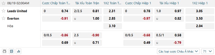 Bảng tỷ lệ kèo bóng đá hôm nay Leeds vs Everton