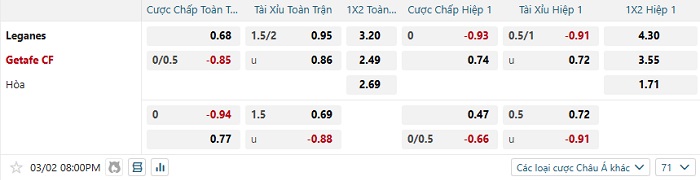 Bảng tỷ lệ kèo bóng đá Leganes vs Getafe