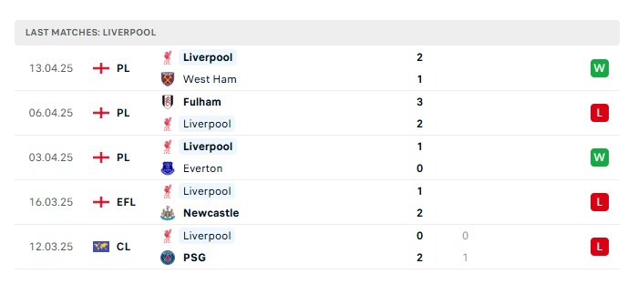 - Phong độ gần đây Liverpool