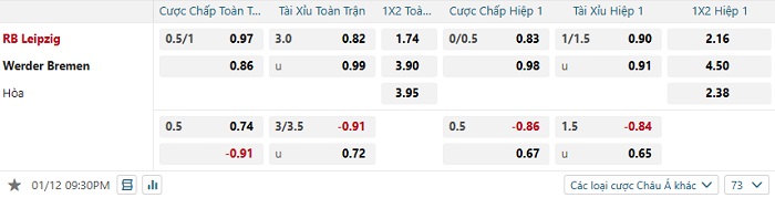 Bảng tỷ lệ kèo bóng đá Leipzig vs Werder Bremen