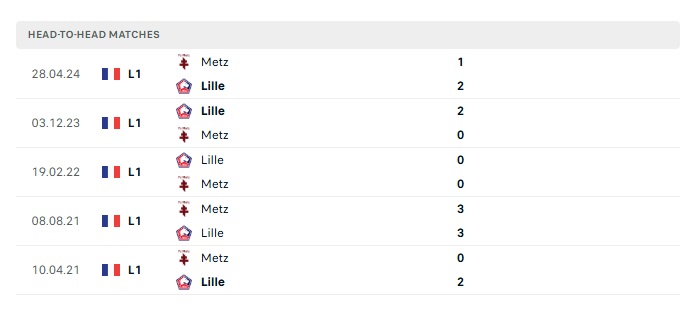 Lịch sử đối đầu Lille vs Metz