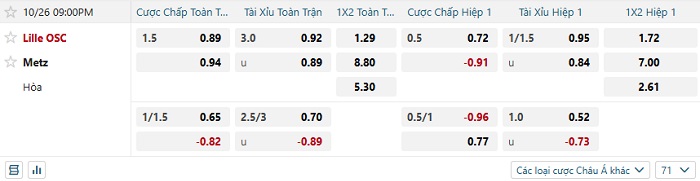 Hiện tại, nhà cái đang niêm yết cho Lille mức chấp -1 1/2 và họ hoàn toàn tự tin có cho mình 3 điểm trước Metz cũng như thắng kèo. Nên biết rằng đã 8 trận đấu liên tiếp vừa qua của Metz khép lại mà họ toàn thua kèo. Trong khi đó thì Lille đang có 6/9 trận gần nhất thắng kèo trước đối thủ. Do đó, kèo châu Á trận đấu hôm nay sẽ có đội chủ nhà Lille là lựa chọn an toàn nhất trong cả 2 hiệp thi đấu.