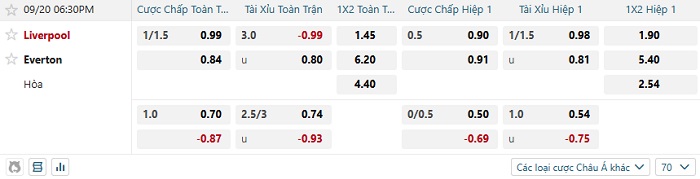 Bảng kèo nhà cái Liverpool vs Everton