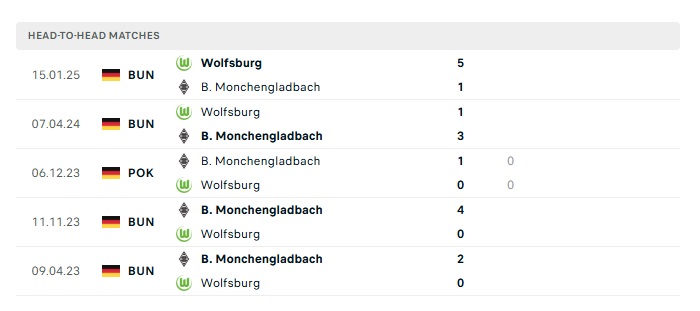 Lịch sử đối đầu M.gladbach vs Wolfsburg
