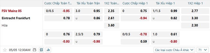 Bảng tỷ lệ kèo nhà cái Mainz vs Ein.Frankfurt