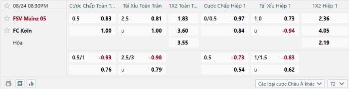 Bảng tỷ lệ kèo nhà cái Mainz vs FC Koln