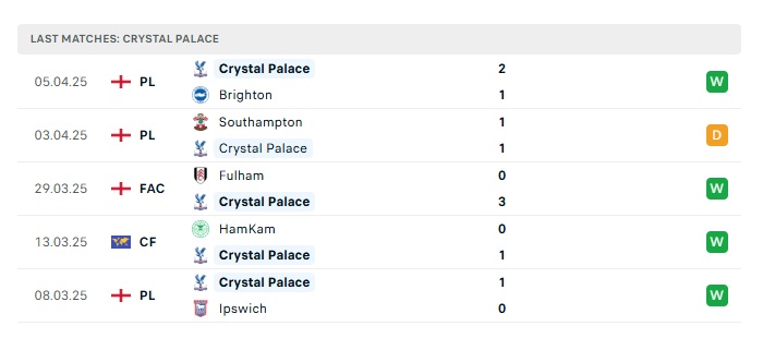 - Phong độ gần đây Crystal Palace