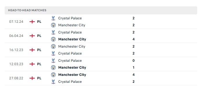 Lịch sử đối đầu Man City vs Crystal Palace