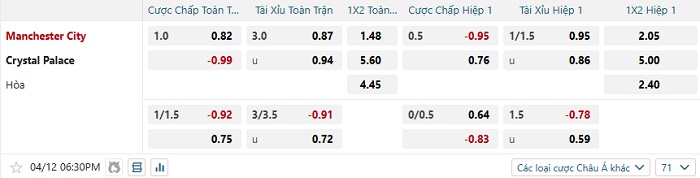 Bảng tỷ lệ kèo bóng đá Man City vs Crystal Palace