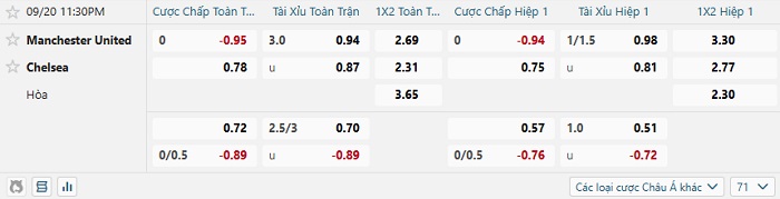 - Kèo tỷ số H1 Man Utd vs Chelsea: 0-0
