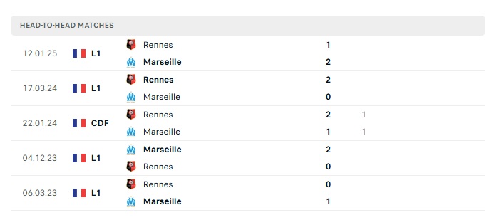 Lịch sử đối đầu Marseille vs Rennes