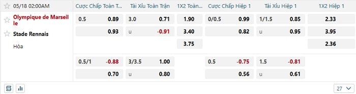 Bảng tỷ lệ kèo bóng đá hôm nay Marseille vs Rennes