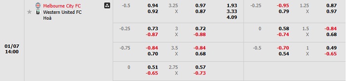 Bảng tỷ lệ kèo bóng đá Melbourne City vs Western United