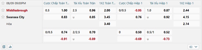 Bảng tỷ lệ kèo bóng đá Middlesbrough vs Swansea City