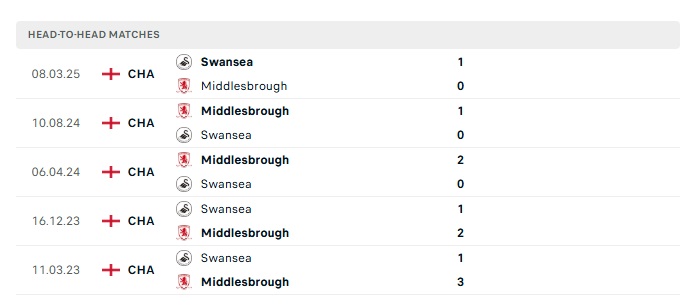 Lịch sử đối đầu Middlesbrough vs Swansea City