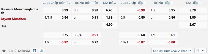 Bảng tỷ lệ kèo bóng đá Monchengladbach vs Bayern Munich