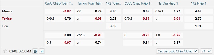 Bảng tỷ lệ kèo bóng đá Monza vs Torino