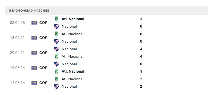 Lịch sử đối đầu Nacional vs Atletico Nacional