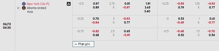 Bảng tỷ lệ kèo bóng đá New York City vs Atlanta United