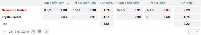 Bảng tỷ lệ kèo bóng đá Newcastle vs Crystal Palace