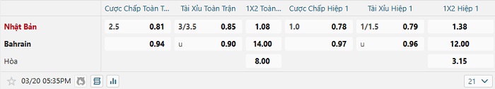Bảng tỷ lệ kèo bóng đá Nhật Bản vs Bahrain