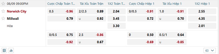 Bảng tỷ lệ kèo bóng đá hôm nay Norwich vs Millwall