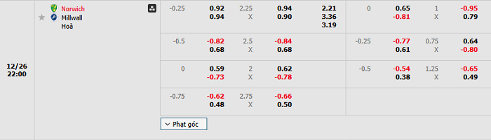 Bảng tỷ lệ kèo bóng đá Norwich vs Millwall