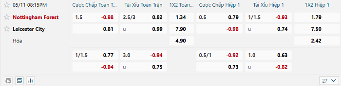 Bảng tỷ lệ kèo bóng đá Nottingham Forest vs Leicester City