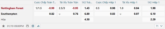 Bảng tỷ lệ kèo bóng đá Nottingham Forest vs Southampton