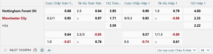 Bảng tỷ lệ kèo nhà cái Nottingham vs Man City