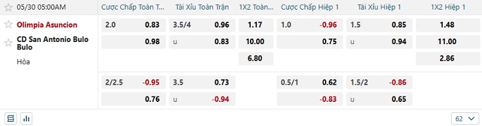 • Kèo tỷ số H1 Olimpia vs San Antonio Bulo Bulo: 0-0