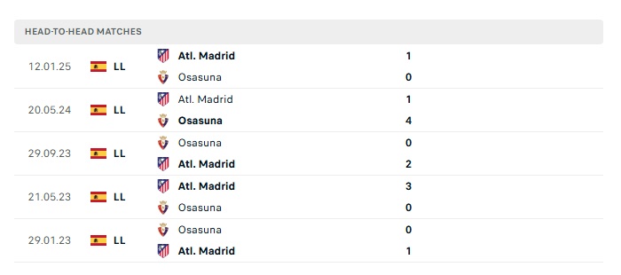 Lịch sử đối đầu Osasuna vs Atletico Madrid