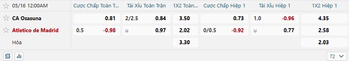 Bảng tỷ lệ kèo bóng đá Osasuna vs Atletico Madrid