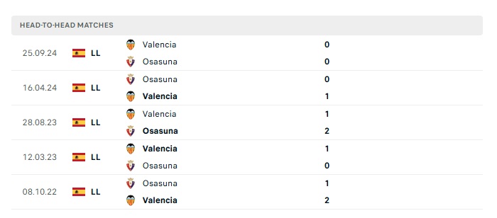 • Kèo tỷ số H2 Osasuna vs Valencia: 0-0