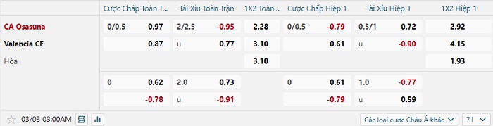 Bảng tỷ lệ kèo bóng đá Osasuna vs Valencia
