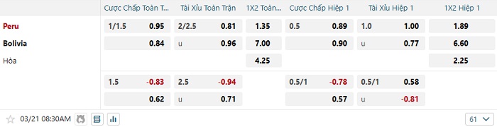 Bảng tỷ lệ kèo bóng đá Peru vs Bolivia