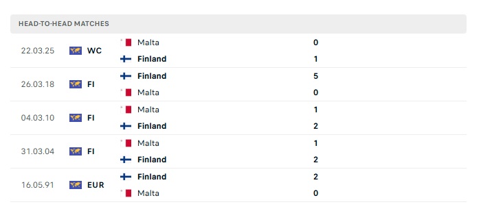 Lịch sử đối đầu Phần Lan vs Malta