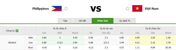 Bảng tỷ lệ kèo bóng đá Philippines vs Việt Nam