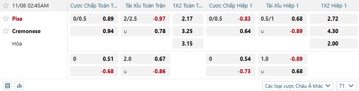 Soi kèo châu Á, kèo Pisa vs Cremonese
