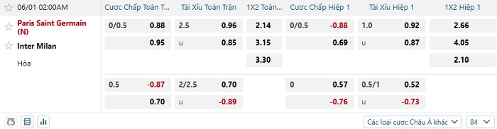 Bảng tỷ lệ kèo nhà cái PSG vs Inter Milan