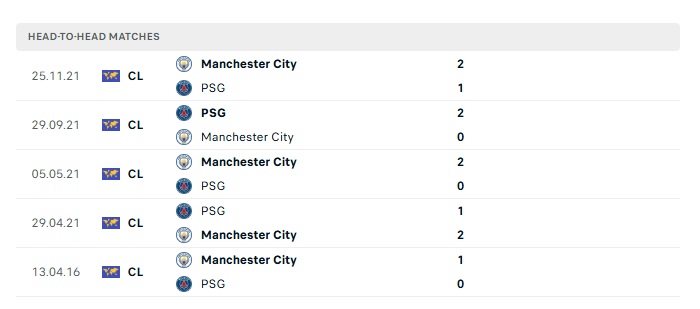Lịch sử đối đầu PSG vs Man City