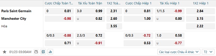 Bảng tỷ lệ kèo bóng đá PSG vs Man City