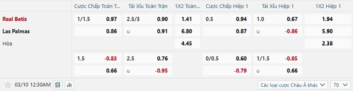 Bảng tỷ lệ kèo bóng đá Real Betis vs Las Palmas