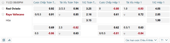 Bảng tỷ lệ kèo bóng đá Real Oviedo vs Rayo Vallecano