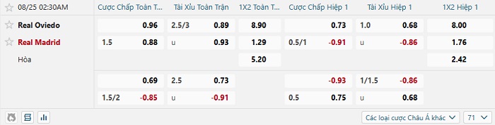 Bảng tỷ lệ kèo nhà cái Real Oviedo vs Real Madrid